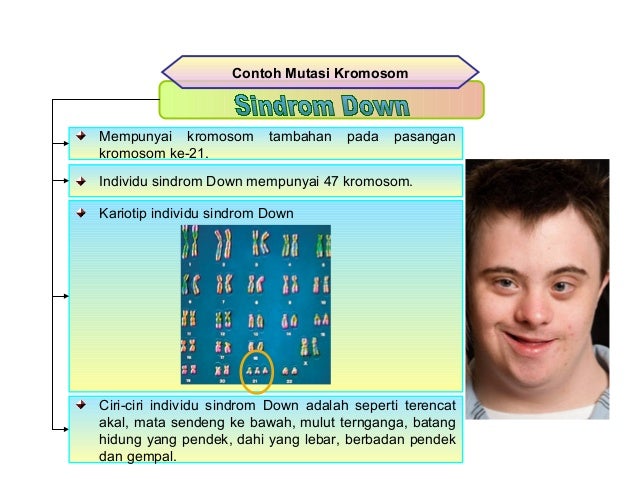 Sindrom down47 XXXY Sindrom down bisa terjadi jika terjadi penambahan satu buah kromosom pada kromosom tubuhautosom pada kromosom nomor 21 sehingga penderita memiliki jumlah kromosom 47XXXY45A XXXY. Mata yang miring ke atas dan keluar. Sindrom bermakna kehadiran sekumpulan gejala dan tanda yang boleh menunjukkan kepada sesuatu penyakit.
