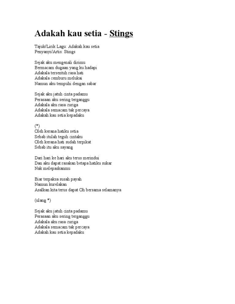 Posted on Ultimate-guitar Adakah Kau Setia - Stings Am G Sejak aku mengenali dirimu E Am Bermacam dugaan yang ku hadapi Dm Am Adakala tersentuh rasa hati Dm Am Adakala cemburu melukai F E Am Namun aku tempuhi dengan sabar Am G Sejak aku jatuh cinta padamu E Am Perasaan aku sering terganggu Dm Am Adakala aku rasa curiga Dm. Adakah ini balasan setia bridge Biar seribu mawar Tak bisa memekarkan Tak bisa mewangikan Di pintu jiwa yang kau kecewakan Usah merisik lagi Takkan kau miliki Aku kini bahagia Tanpa cinta yang pura-pura korus Kala hati ingin kau bersama Engkau tega memilihnya Di mana aku kau letakkan Di hatimu Siang malam cuba kumenipu Perasaan hati ini. Adakala aku rasa curiga.