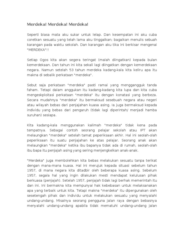 Erti kemerdekaan bukan sahaja bebas daripada cengkaman penjajah semata-mata malah kebebasan minda daripada terpengaruh dengan anasir-anasir luar yang mahu melihat berlakunya. Di zaman penjajah kekayaan watan dirompak dan dibawa pulang ke negara mereka. Negara kita kini bebas setelah beratus-ratus tahun dijajah dan hidup dalam penderitaan dan tiada kebebasan.
